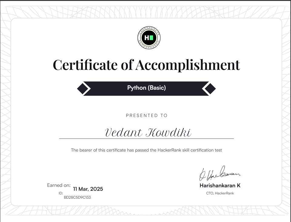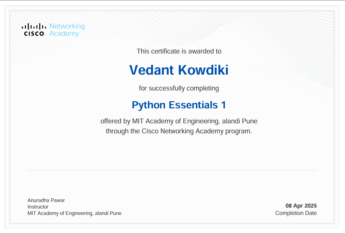Hey, I am Vedant Kowdiki currently embarking my career from M.I.T. Academy Of Engineering, Alandi, Pune. I am a Web-developer. I do love competitive programming as problem solving has always been my cup of tea. Apart from technical skills I am writer and an amiable person. I do often play games and make games too. I love project work and interacting with new peoples. If you wish to know me, go ahead i am an open-book.